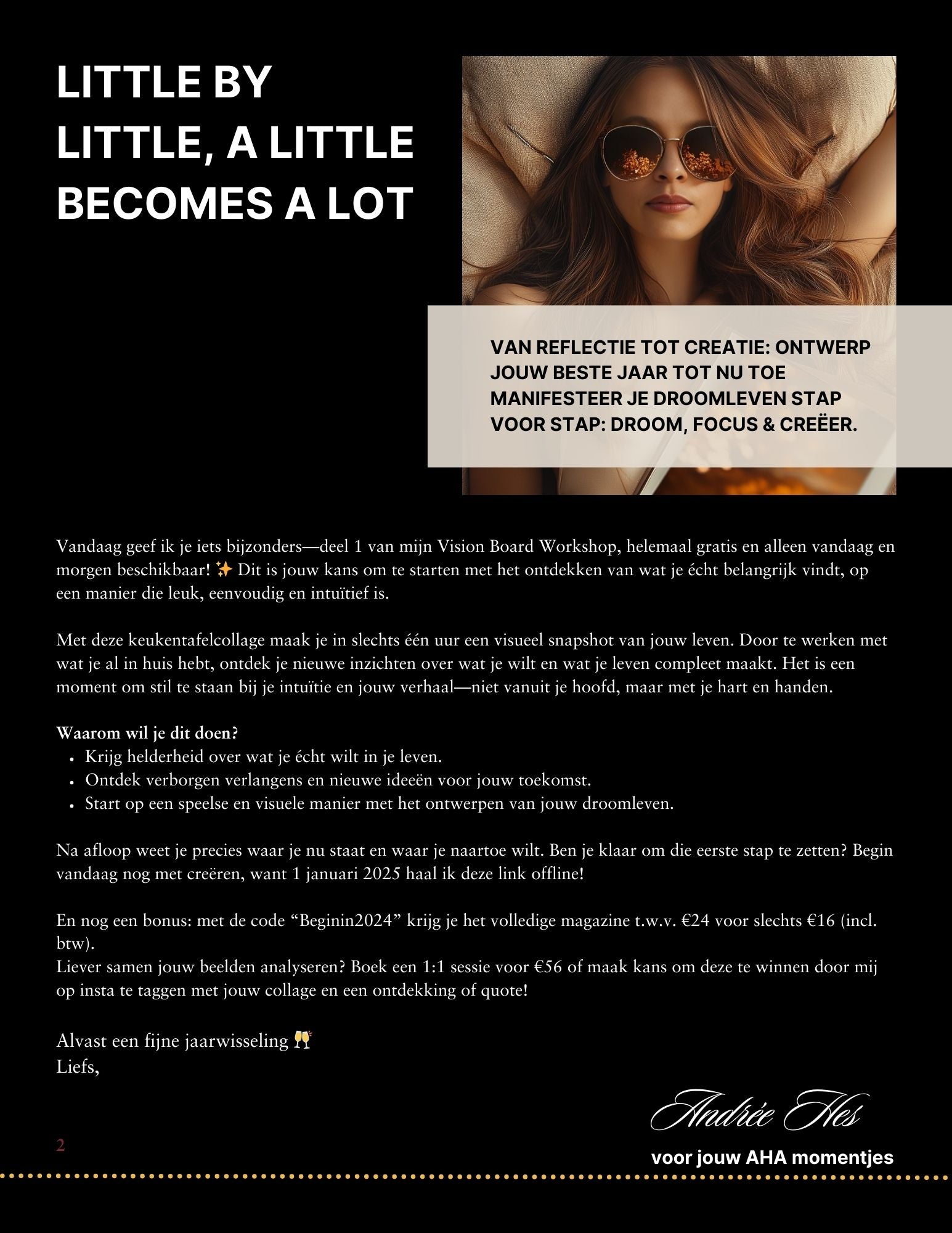 Met dit cadeautje krijg je een voorproefje van mijn complete DIY Vision Board magazine, speciaal ontworpen om je te helpen jouw visie tot leven te brengen. Na jouw gratis collage kun je met de code “Beginin2024” het magazine aanschaffen voor slechts €16 incl. btw. Daarnaast maak je kans op een 1:1 sessie waarin we samen jouw beelden analyseren. ✨